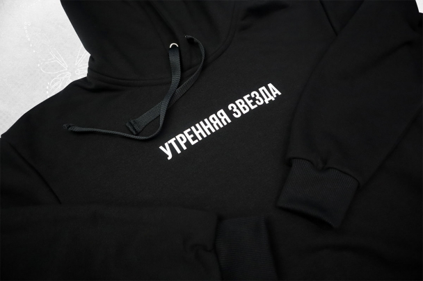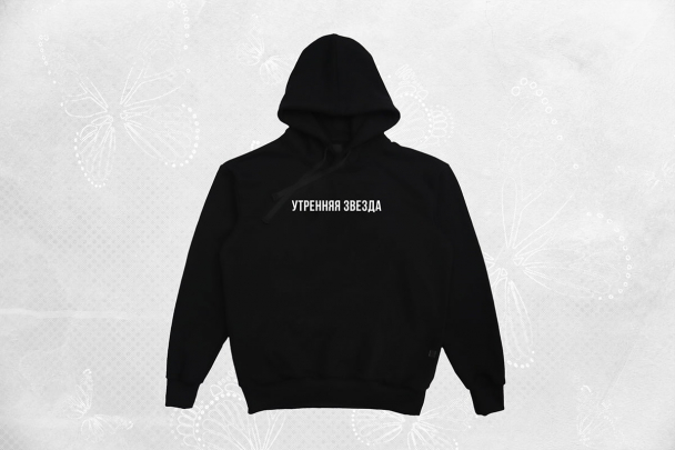 Худи оверсайз, капюшон с черными шнурками, эластичные манжеты и пояс.