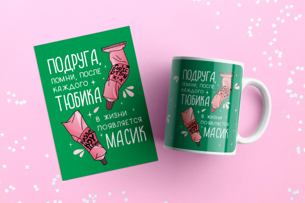 Передай своей подружке этот рецепт красоты — подари ей набор из кружки с открыткой. Кружка сделана из премиальной керамики, принт не сотрётся спустя кучу лет, даже если тереть его щёткой или мыть в посудомоечной машине. А открытка напечатана на матовом картоне, детали рисунка приятные на ощупь, потому что мы выделили их глянцевым УФ-лаком.