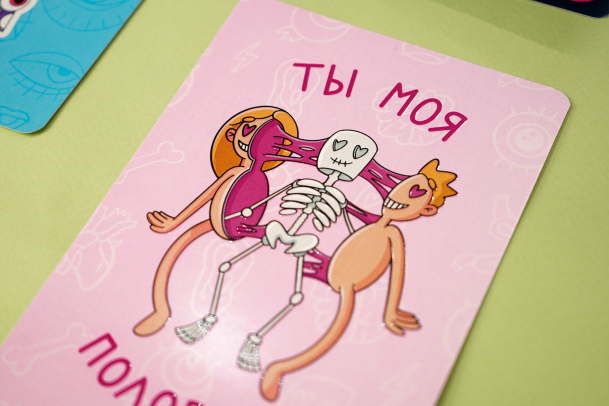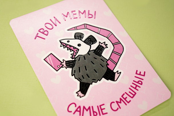 Набор из трёх открыток формата А6 с лаковым нанесением по контуру рисунка выглядит особенно хорошо, потому что контрастирует с матовой основой.