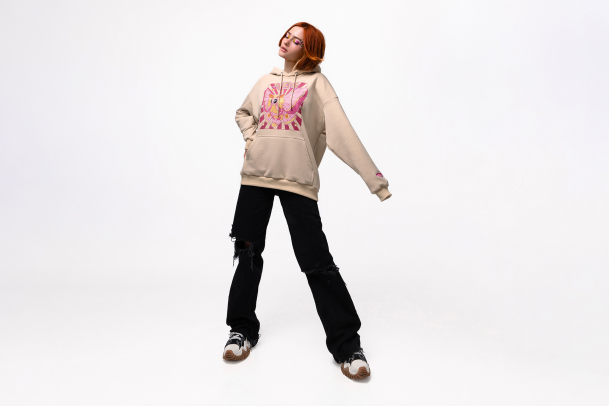 Бежевое оверсайз худи с милой молью, надписью «Я люблю тебя» на корейском и фразой «Ooh girl» сделает милашек даже из самых суровых ребят. В составе 80% хлопка, поэтому ткань приятно прилегает к телу, а фасон оверсайз не сковывает движения. Худи подойдёт абсолютно каждый день и станет незаменимой вещью в твоём гардеробе.