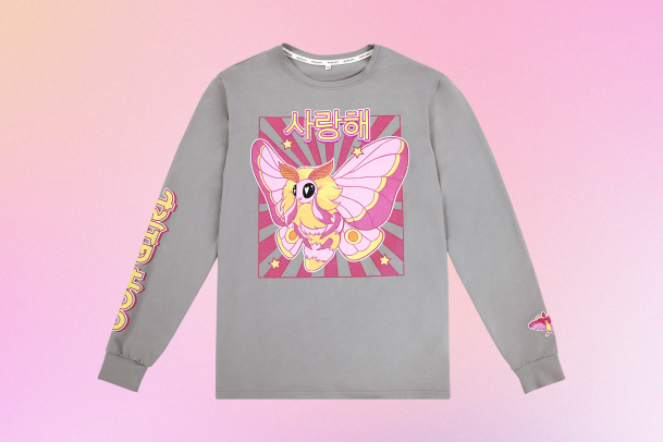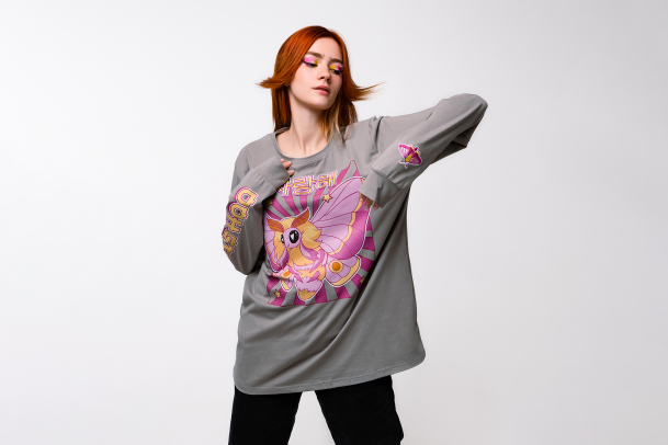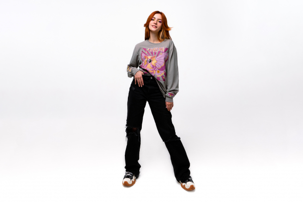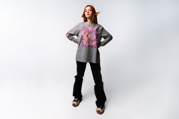Серый оверсайз лонгслив с надписью надписью «Я люблю тебя» на корейском, милой розовой молью и и фразой «Ooh girl» станет идеальной основой любого вашего образа. В составе 92% хлопка, ткань приятно прилегает к телу, а фасон не сковывает движения.