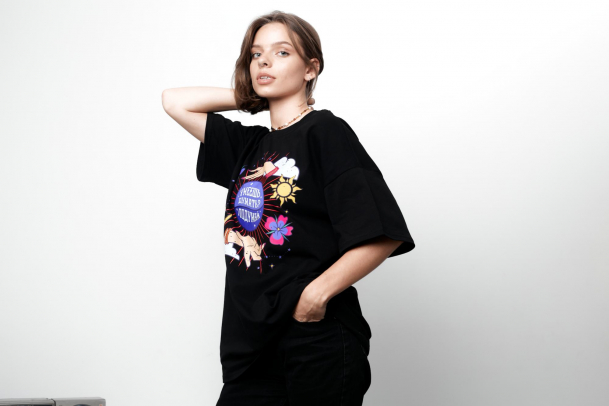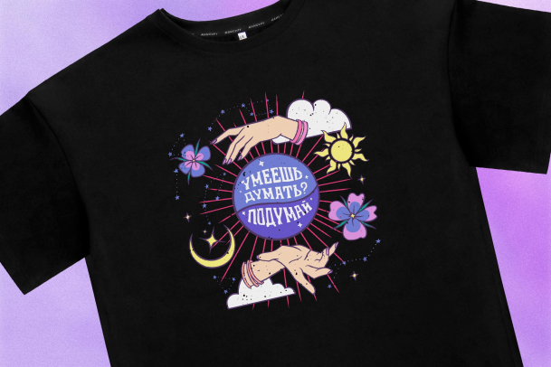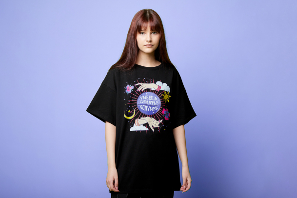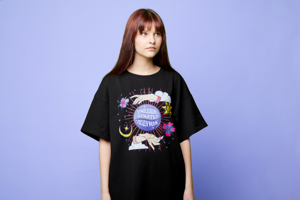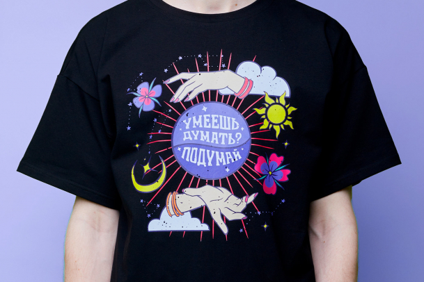 Удобнее всего уходить в размышления в чёрной оверсайз футболке с принтом «Думай». Она сшита из плотной мягкой ткани, не мнётся и выглядит отлично даже после долгих посиделок на библиотечном кресле с книгой. У майки свободный крой, она приятно касается кожи и не сковывает движения. А принт остаётся ярким и не трескается после стирки.
