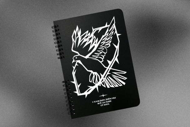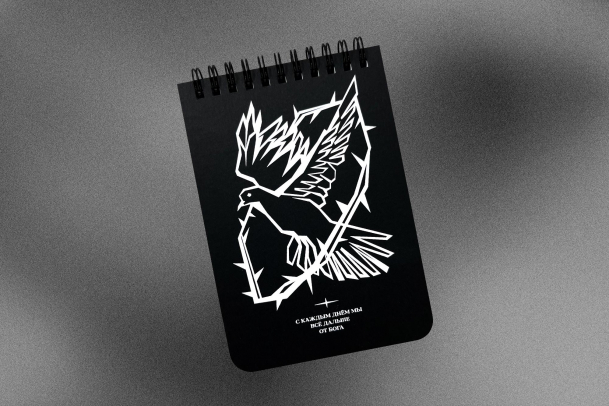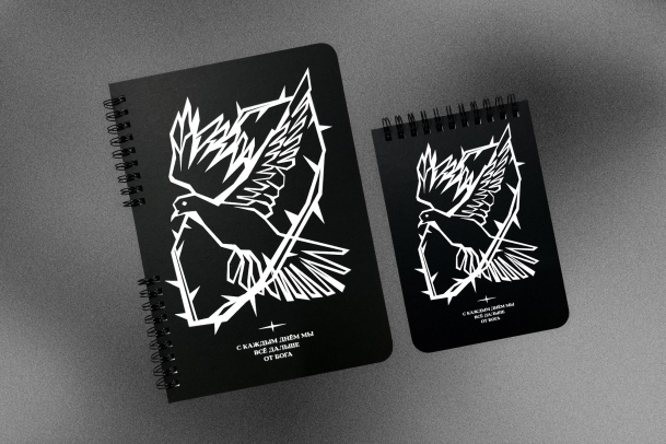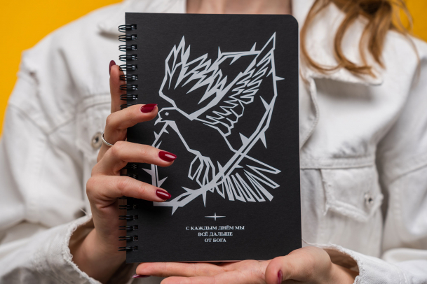 Голубь на обложке — наше переосмысление иллюстрации Пабло Пикассо. Под рисунком напечатана фраза: «С каждым днём мы всё дальше от бога.»