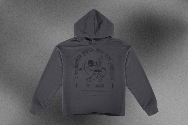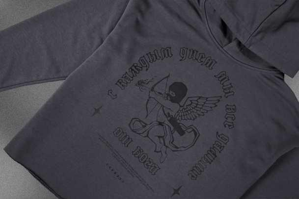 На ней изображен Купидон: он спрятал лицо в балаклаве, а подпись «С каждым днём мы всё дальше от бога» выполнена в готическом шрифте, добавляя рисунку таинственности. Принт долго держится на ткани, не выцветает и не трескается.