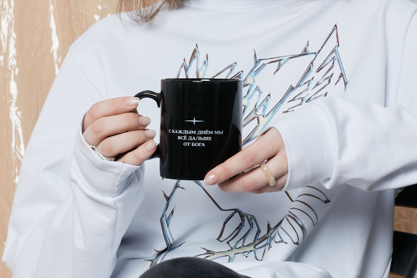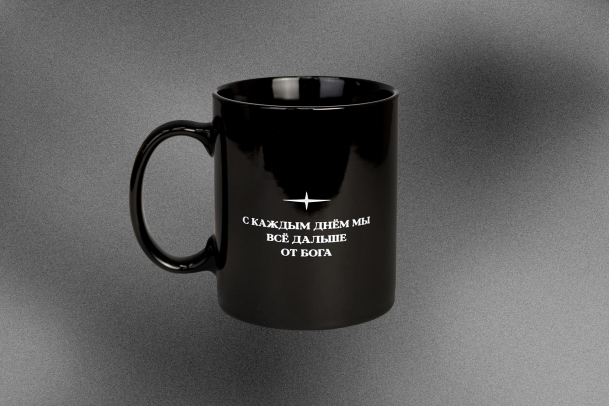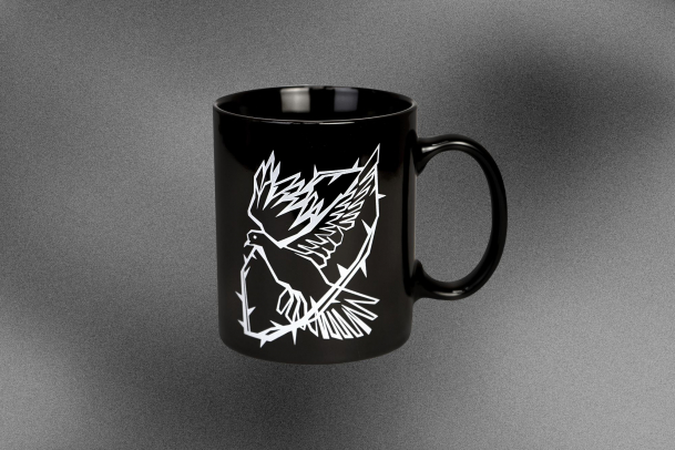 Голубь на кружке — наше переосмысление иллюстрации Пабло Пикассо. Он выполнен в стилистике брутализм: стал острым, резким, серьёзным. Под рисунком напечатана фраза: «С каждым днём мы всё дальше от бога.»