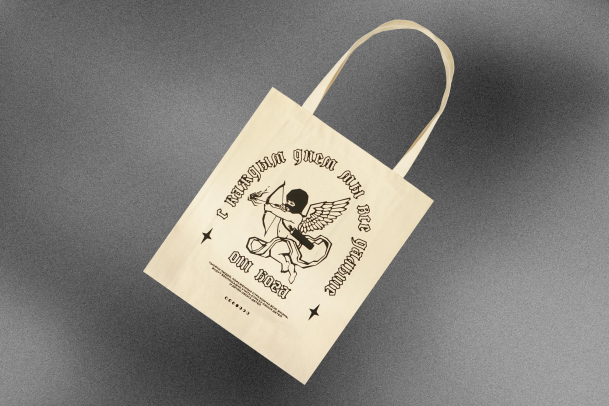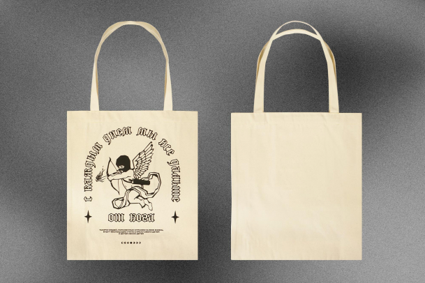 На нём изображен Купидон: он спрятал лицо в балаклаве, а подпись «С каждым днём мы всё дальше от бога» выполнена в готическом шрифте, добавляя рисунку таинственности. Принт долго держится на ткани, не выцветает и не трескается.