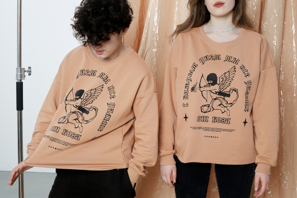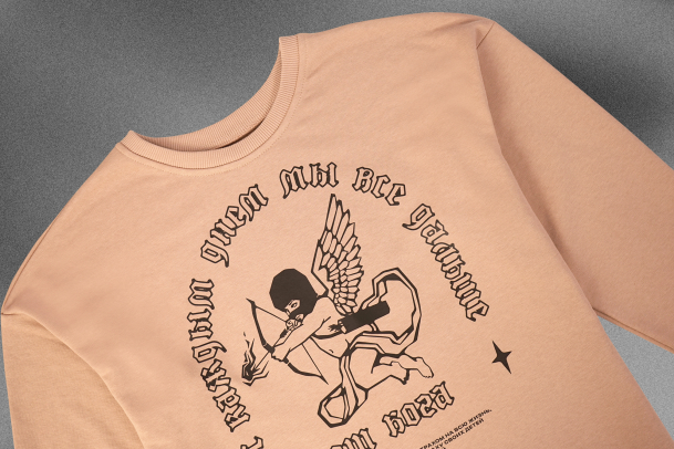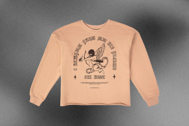 На ней изображен Купидон: он спрятал лицо в балаклаве, а подпись «С каждым днём мы всё дальше от бога» выполнена в готическом шрифте, добавляя рисунку таинственности. Принт долго держится на ткани, не выцветает и не трескается.