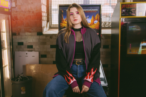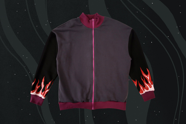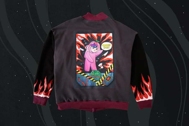 Бомбер серого цвета с принтом. Принт нанесен методом сублимации. Печать на рукавах выполнена методом шелкографии.