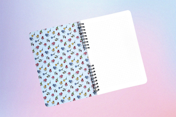 - Блокнот на пружине формата А5, а линовка – в удобную точку. Внутри плотная бумага, которая подойдёт и для записей, и для набросков;
