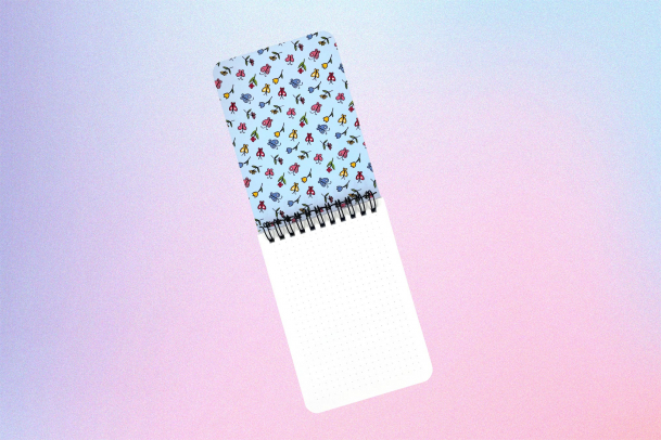 - Блокнот на пружине формата А6, а линовка – в удобную точку. Внутри плотная бумага, которая подойдёт и для записей, и для набросков;