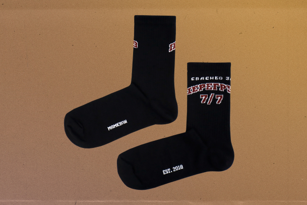 Подари тому, кто сильно грузит. (Себе тоже можно) Длинные чёрные носки с надписью. Надпись: "Спасибо за перегруз 7/7".