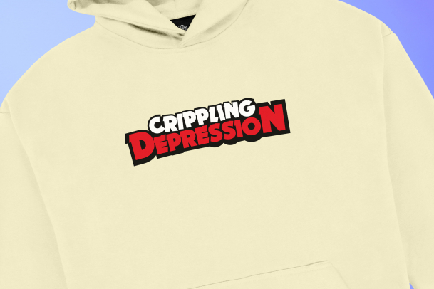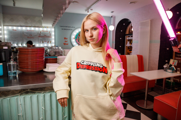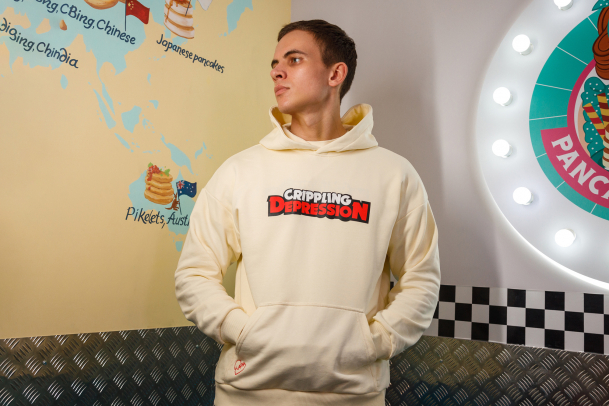 Это оверсайз худи с принтом «Crippling Depression» станет основой образа для похода на терапию. В нём удобно распластаться в кресле, обсуждать детские травмы и делиться переживаниями. У него мягкая ткань, которая не мнётся. Принт держится очень долго, поэтому вы сможете носить кофту даже после завершения терапии.