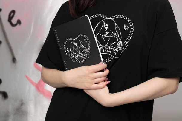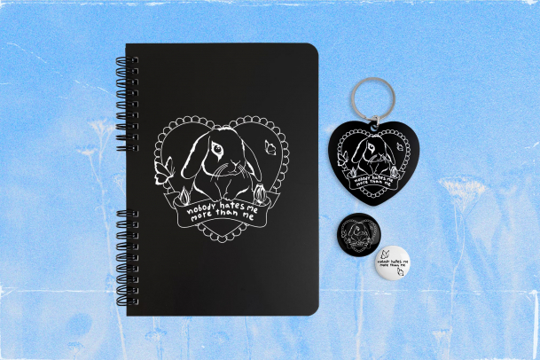 Запишите все неудачи в блокнот формата А5 с милым кроликом, у этого скетчбука линовка в точку, поэтому в нём удобно рисовать и делать записи. А значки и брелок смело повесь на шоппер. Они прекрасно дополняют образ, выглядят красиво, а ещё делают уверенное утверждение: «Nobody hates me more than me».