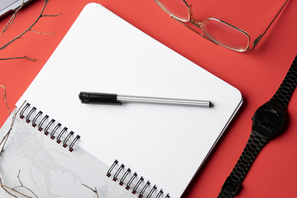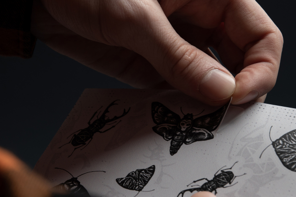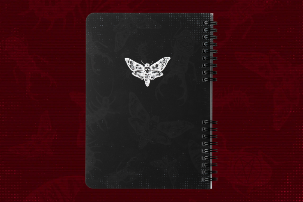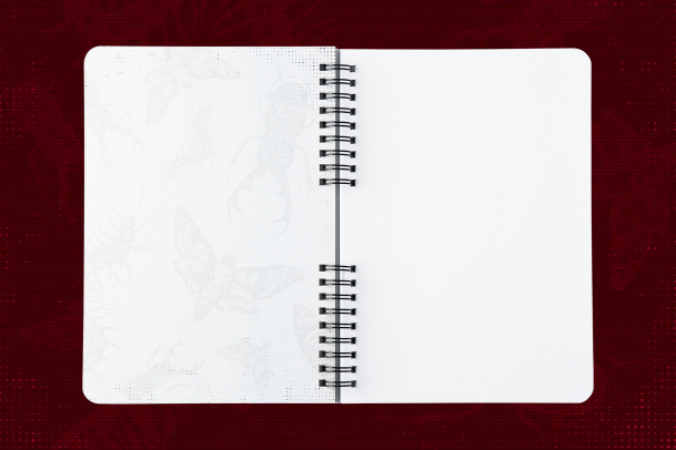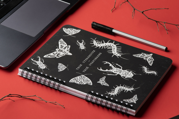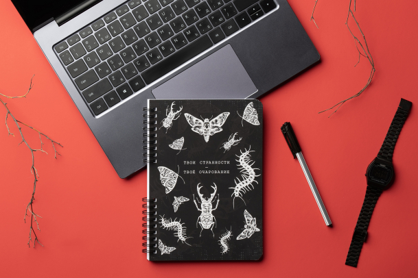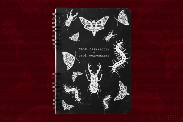 • Блокнот формата А5 украшен жуками на софт-тач обложке. Плотная бумага деликатно разлинована в точку, поэтому идеально подходит для зарисовок и записей.