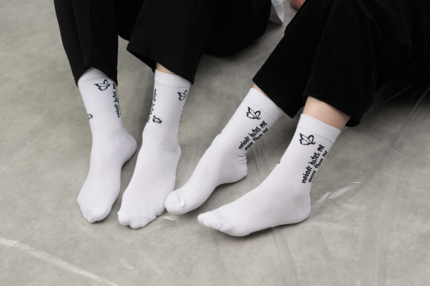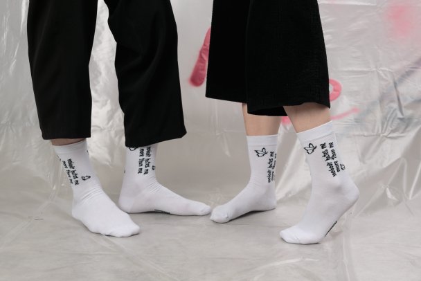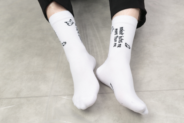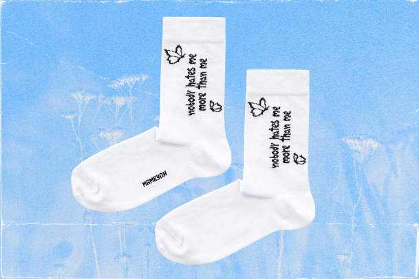 Желательно собрать вещи и уйти подальше от себя. Перед этим важно надеть носки с надписью «Nobody hates me more than me». Они удобно сидят на пяточке. Хлопок в составе делает ткань мягкой и приятной, а спандекс позволяет ей хорошо тянуться, не терять форму и вид даже с годами.