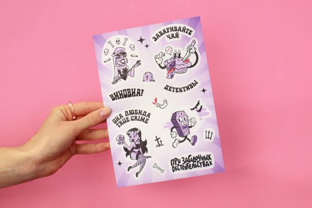 Загадочные виниловые стикеры с надписями про true crime помогут тебе украсить все вокруг. Можешь наклеить их на телефон, ноутбук, стену, зеркало — куда угодно! Выполнены в приятном лавандовом цвете — самом стильном цвете сезона.