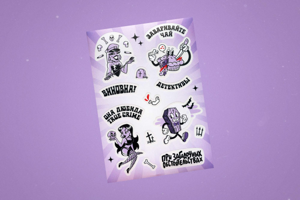 Стикерпак выпущен в рамках коллаборации мем-ателье "Мам, купи!" И YouTube-блогерки Маруси Черничкиной. На своём канале она снимает ролики, в которых раскрывает загадки самых необычных преступлений. Покупая мерч Маруси, вы поддерживаете любимого блогера и получаете отличные аксессуары в качестве напоминания о своем участии.