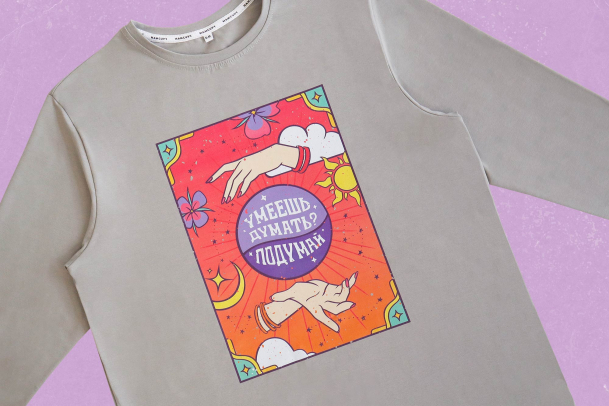 Огромный цветастый принт выполнен с соблюдением технологии, легко переносит стирку, не может стереться, отвалиться или потерять в цвете. Надпись «Умеешь думать? Подумай» иронически отсылает к роликам Энтони Юлая.