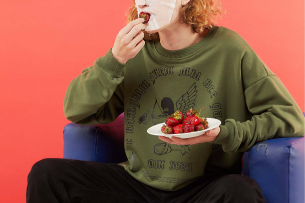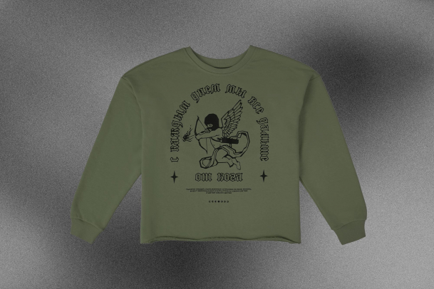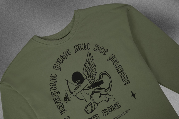 На ней изображен Купидон: он спрятал лицо в балаклаве, а подпись «С каждым днём мы всё дальше от бога» выполнена в готическом шрифте, добавляя рисунку таинственности. Принт долго держится на ткани, не выцветает и не трескается.