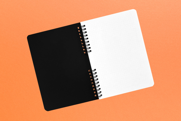 • Блокнот на пружине. У него удобный формат А5, который поместится почти в каждую сумку. А линовка в точку отлично подходит и для записей, и для зарисовок.