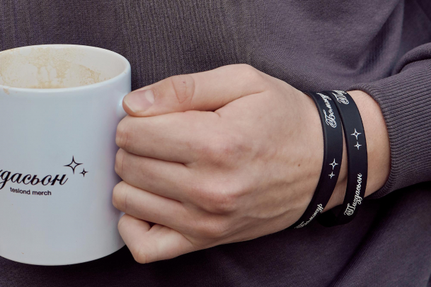 Коллекция вышла в коллаборации «Мам, купи!» с Сашей Теслонд – блогером, который снимает влоги и лайфстайл видео на своём YouTube-канале. Покупая его мерч, ты получаешь красивую вещь и поддерживаешь любимого блогера.Браслет: