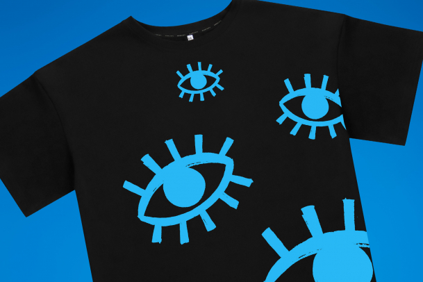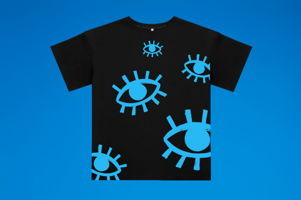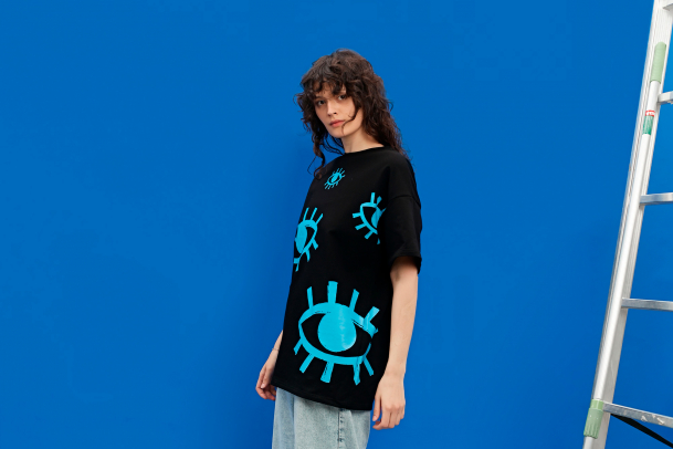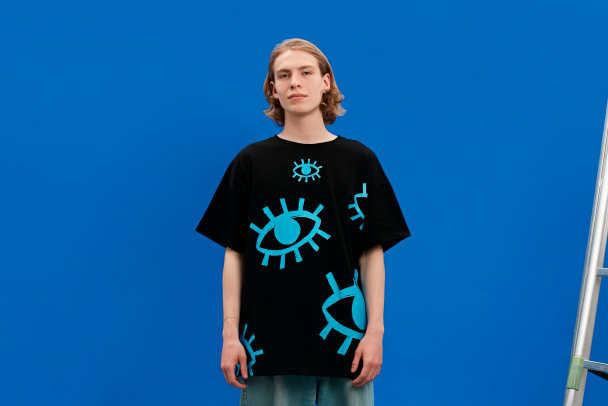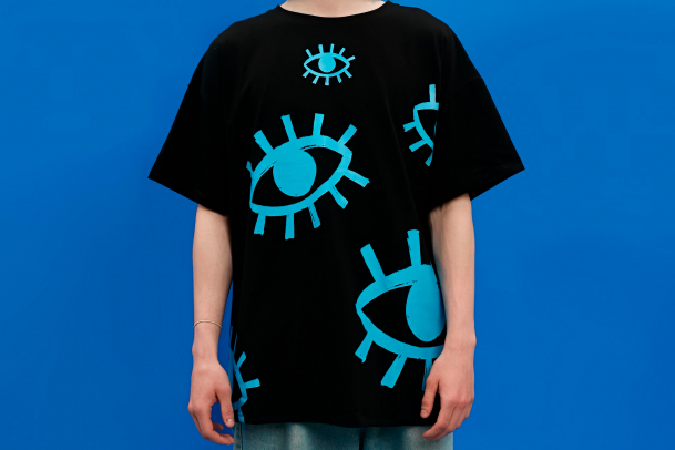 Удобную оверсайз футболку с ярким принтом из множества сапфирово-синих глаз. Они помогут в поиске интересных фильмов на вечер, которые понравятся всей компании. Ну или находить ключи, телефон – всё зависит от поискового запроса.