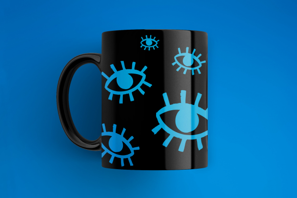 Кружку стандартной формы, из керамики и с глазастым принтом.
