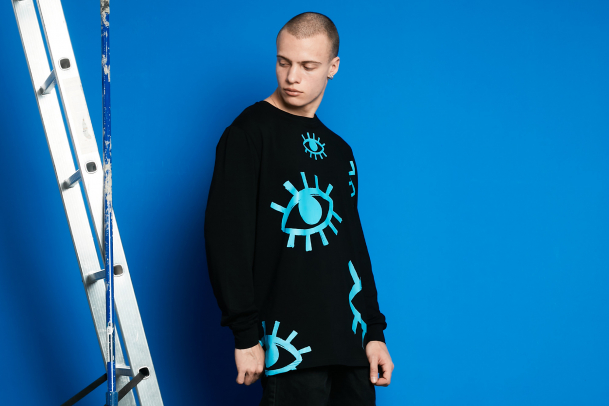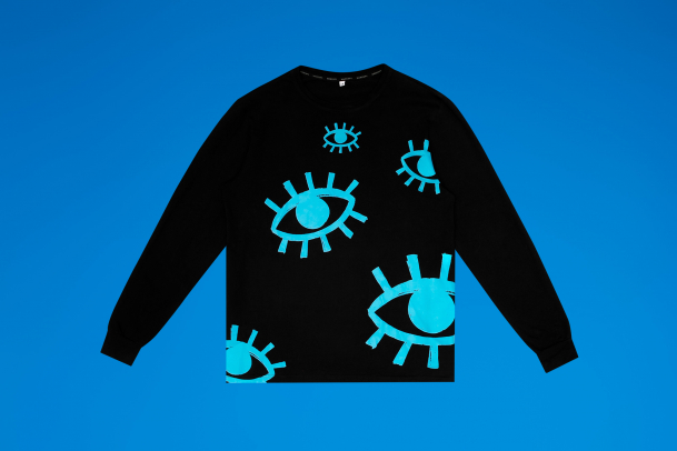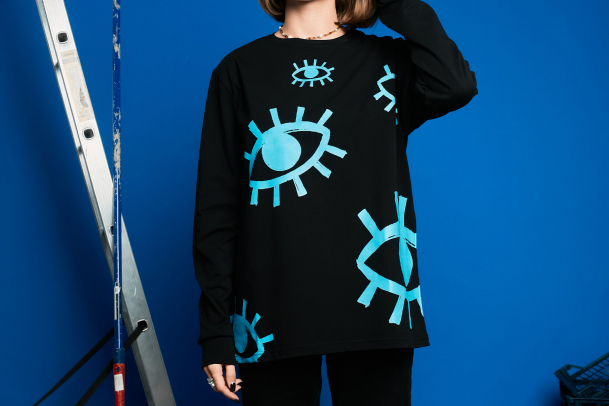 Чёрный оверсайз лонгслив с ярким принтом из множества сапфирово-синих глаз.