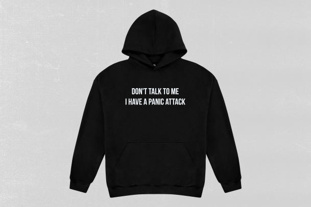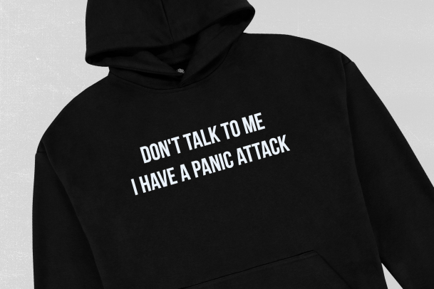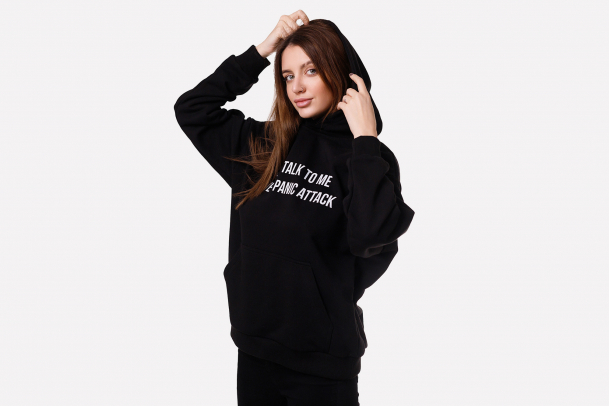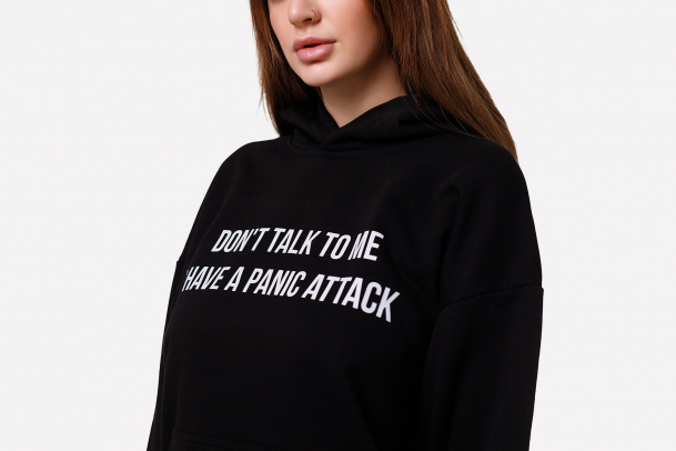 Худи с вызывающей надписью: «don’t talk to me I have a panic attack» унисекс и подходит как девушками, так и парням. В составе 80% хлопка, поэтому ткань приятно прилегает к телу, а фасон оверсайз не сковывает движения. В этой толстовке ты сможешь смело гулять по улицам и быть уверенным — люди обойдут тебя стороной.